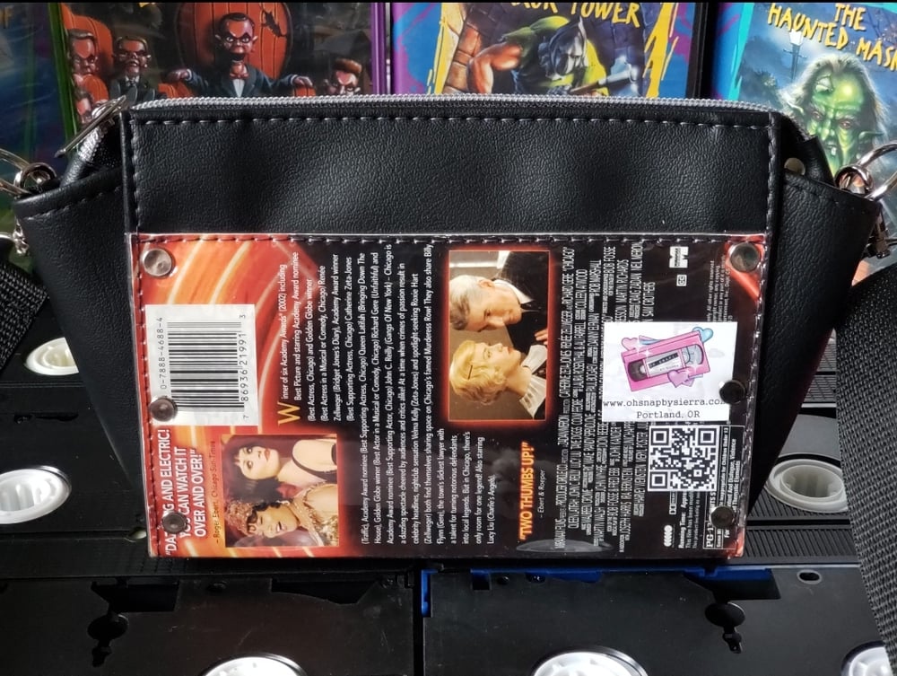 Made from the original VHS sleeve, marine vinyl & clear vinyl, comes w/ an adjustable strap (47" to 62"), if you need a different size please leave it in the "notes" at checkout.