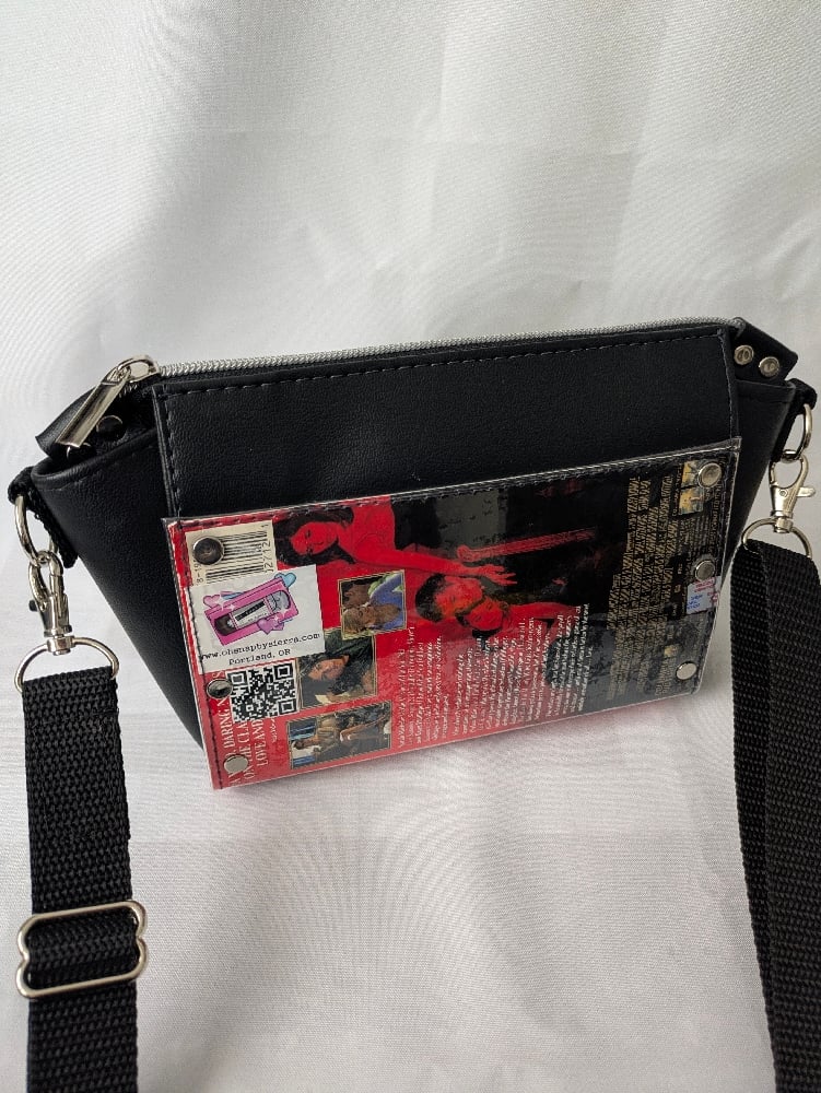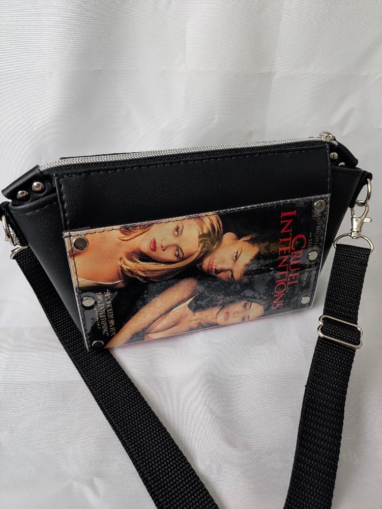 Made from the original VHS sleeve, marine vinyl & clear vinyl, comes w/ an adjustable strap (47" to 62"), if you need a different size please leave it in the "notes" at checkout.