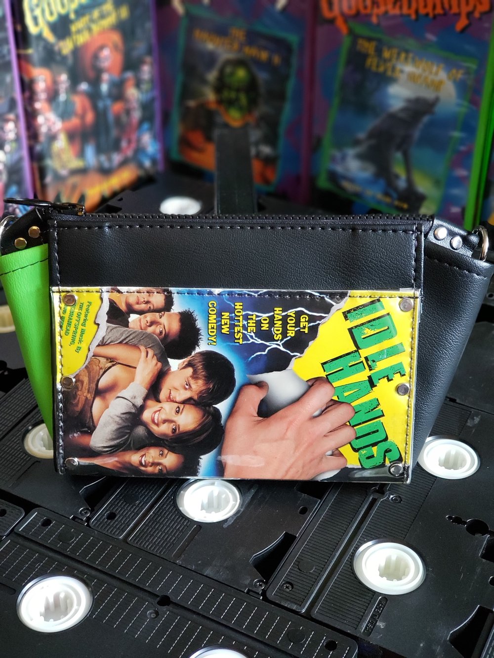 Made from the original VHS sleeve, marine vinyl & clear vinyl, comes w/ an adjustable strap (47" to 62"), if you need a different size please leave it in the "notes" at checkout.